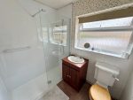 Frosted window to side and a three piece suite to comprise: Low flush WC, pedestal wash hand basin and an independent double shower cubicle with splash backs.