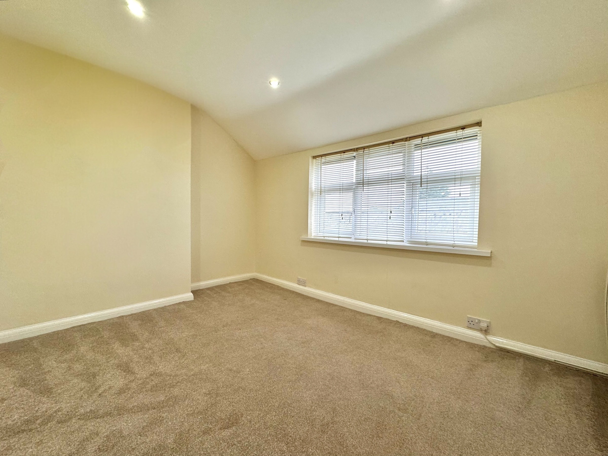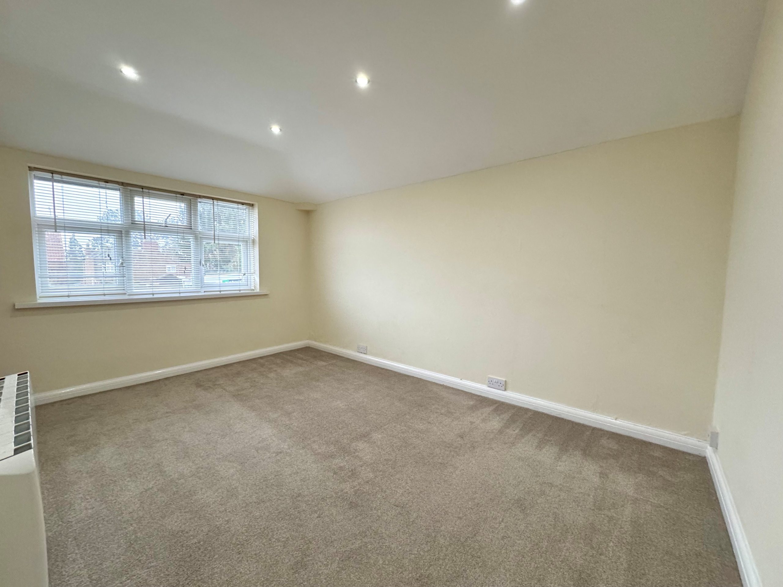 A double bedroom with a window to front and ceiling down lights.