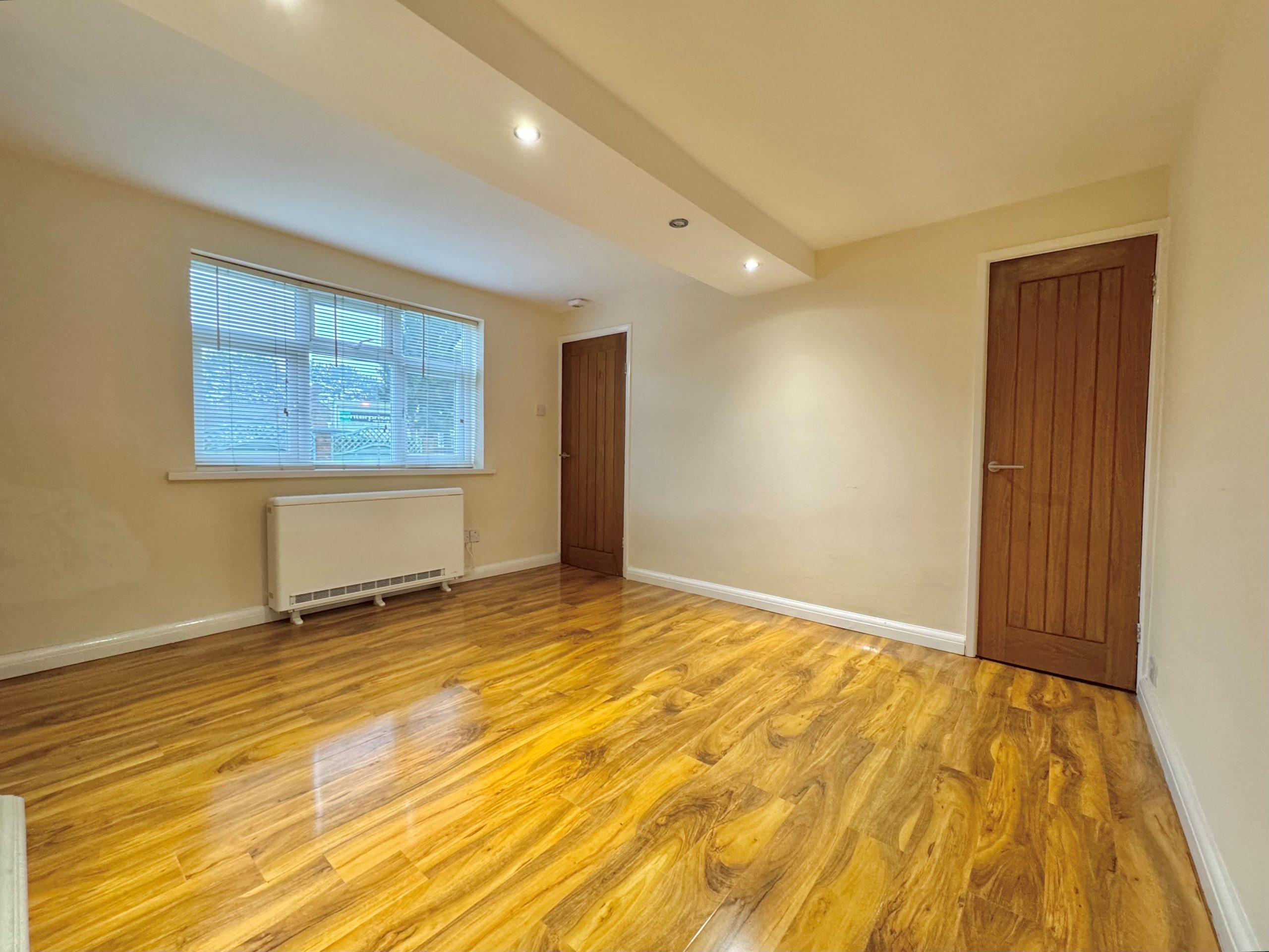 Window to front, open fire recess (not in use), built-in under stairs cupboard with courtesy light and there are ceiling down lights and a door to:
