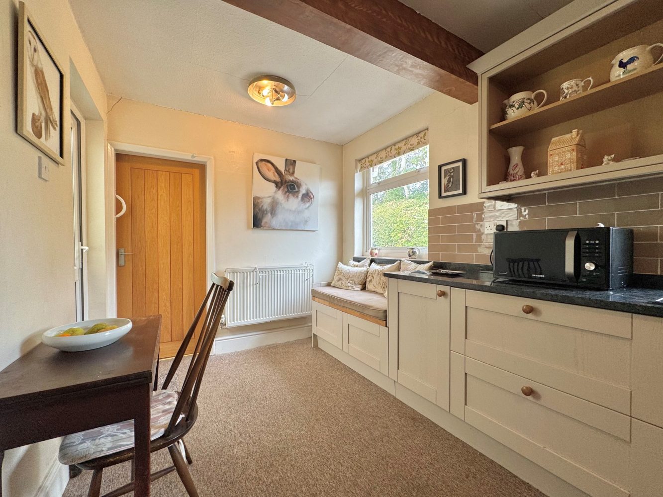 An L-Shaped room which has two windows to side, a walk-in pantry cupboard with a window to rear, power and light connected, space for a fridge freezer, meters and a cold slab. The kitchen dining room has a range of eye and base level units with granite work surfaces and tiled splash backs, a one and a half sink drainer unit, an integrated oven, grill, electric hob with a pull down extractor fan hood, a fitted window seat, door to the bathroom and a door to: