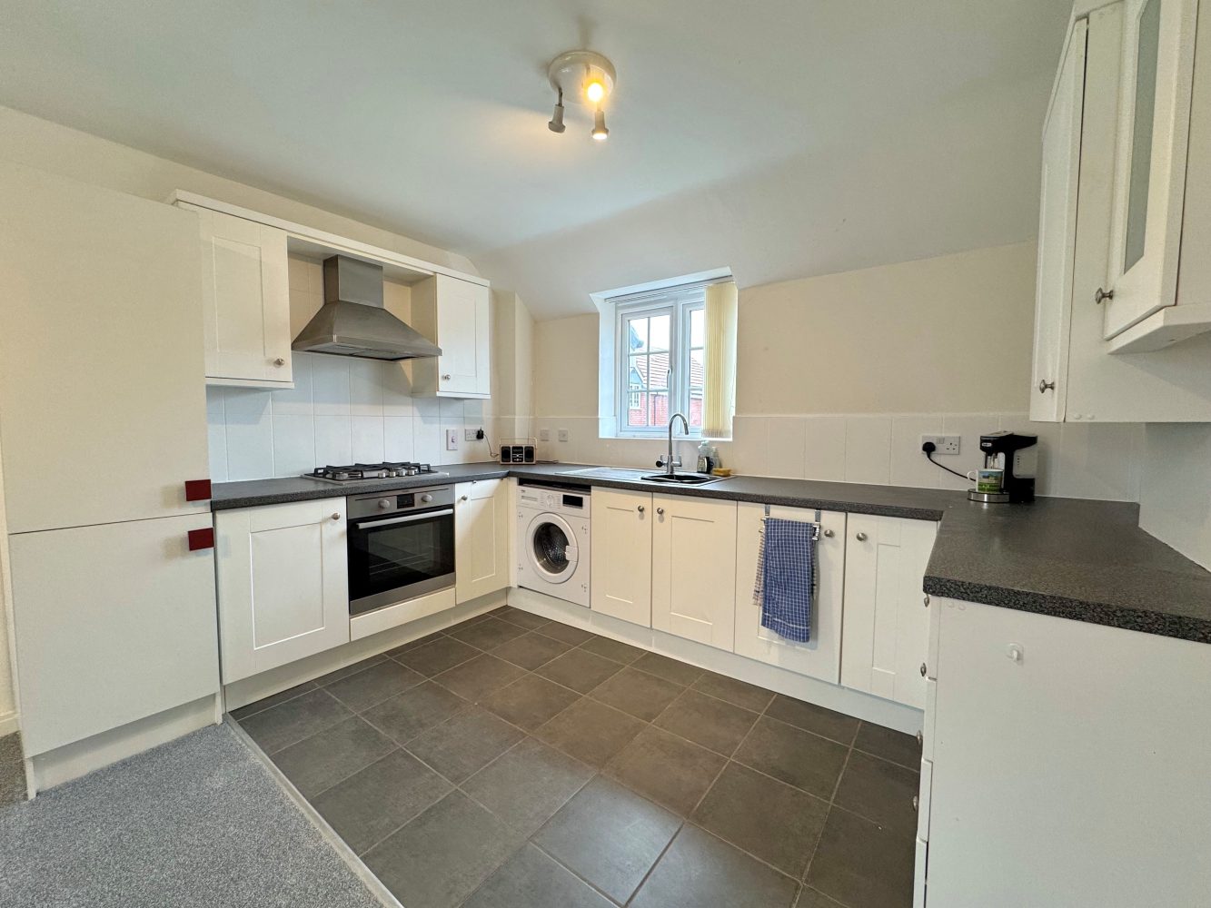 A generous sized and dual aspect room which has a window to front and to rear. There is a range of eye and base level units with roll top work surfaces and tiled splash backs, a sink drainer unit, integrated oven, grill and a gas hob with with a stainless steel extractor fan hood, integrated wash machine, space for a fridge freezer and a wall mounted and concealed 'Glow Worm' boiler.