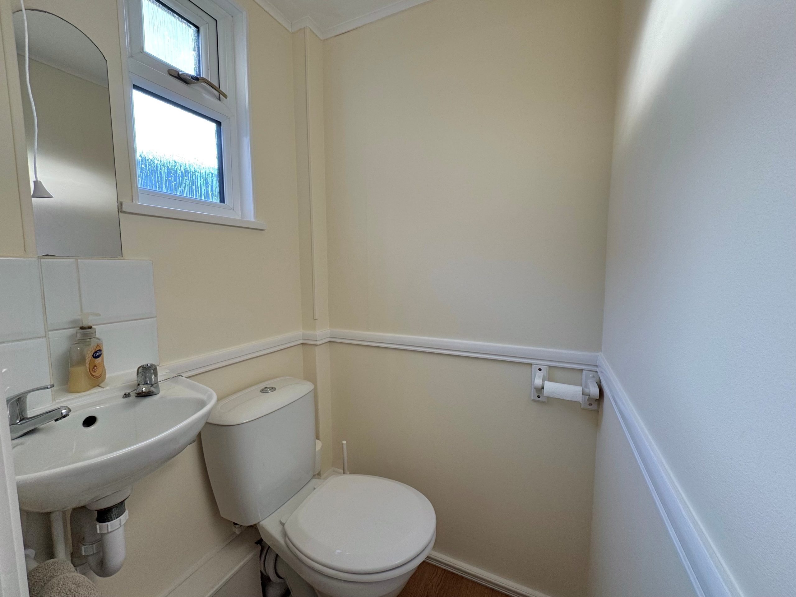 Frosted window to side and a two piece suite to comprise: Low flush WC and awash hand basin with tiled splash backs.