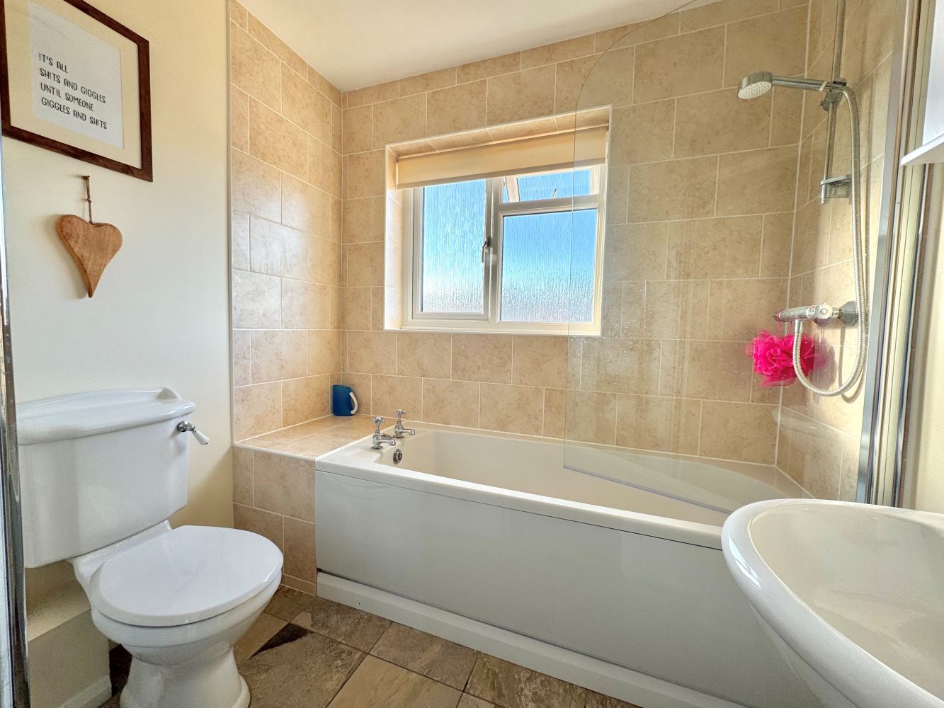 Frosted window to front and a white suite to comprise: Low flush WC, pedestal wash hand basin and a panelled bath with an independent shower and screen above, tiled splash backs, tiled floor and a heated towel rail.