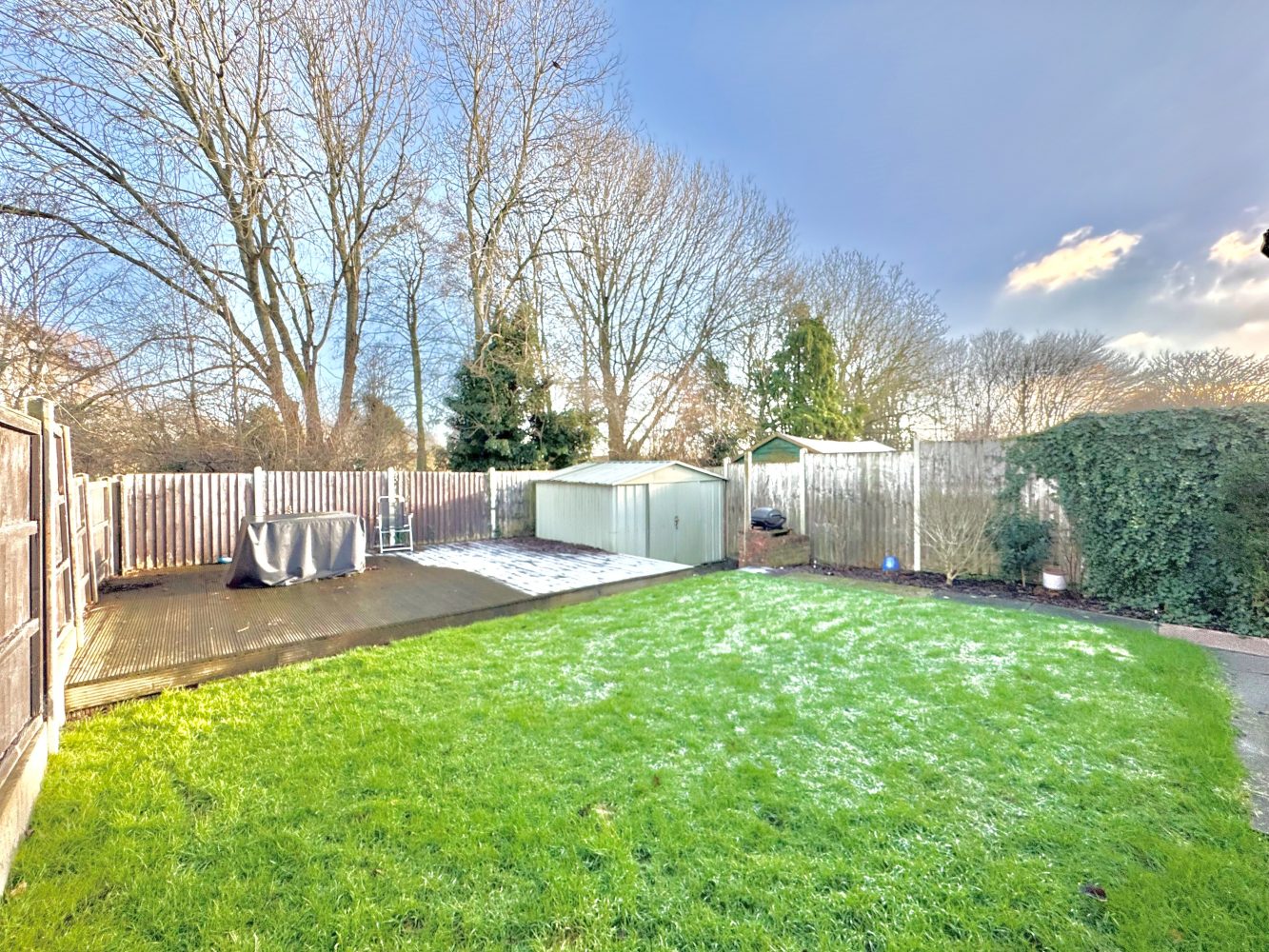 A well tended garden which is mainly laid to lawn with flowers and shrub boarders, there is a patio area with an outside tap, courtesy lighting and towards the end of the garden is a decked area, space for a shed and the garden is mainly enclosed by panelled fencing.