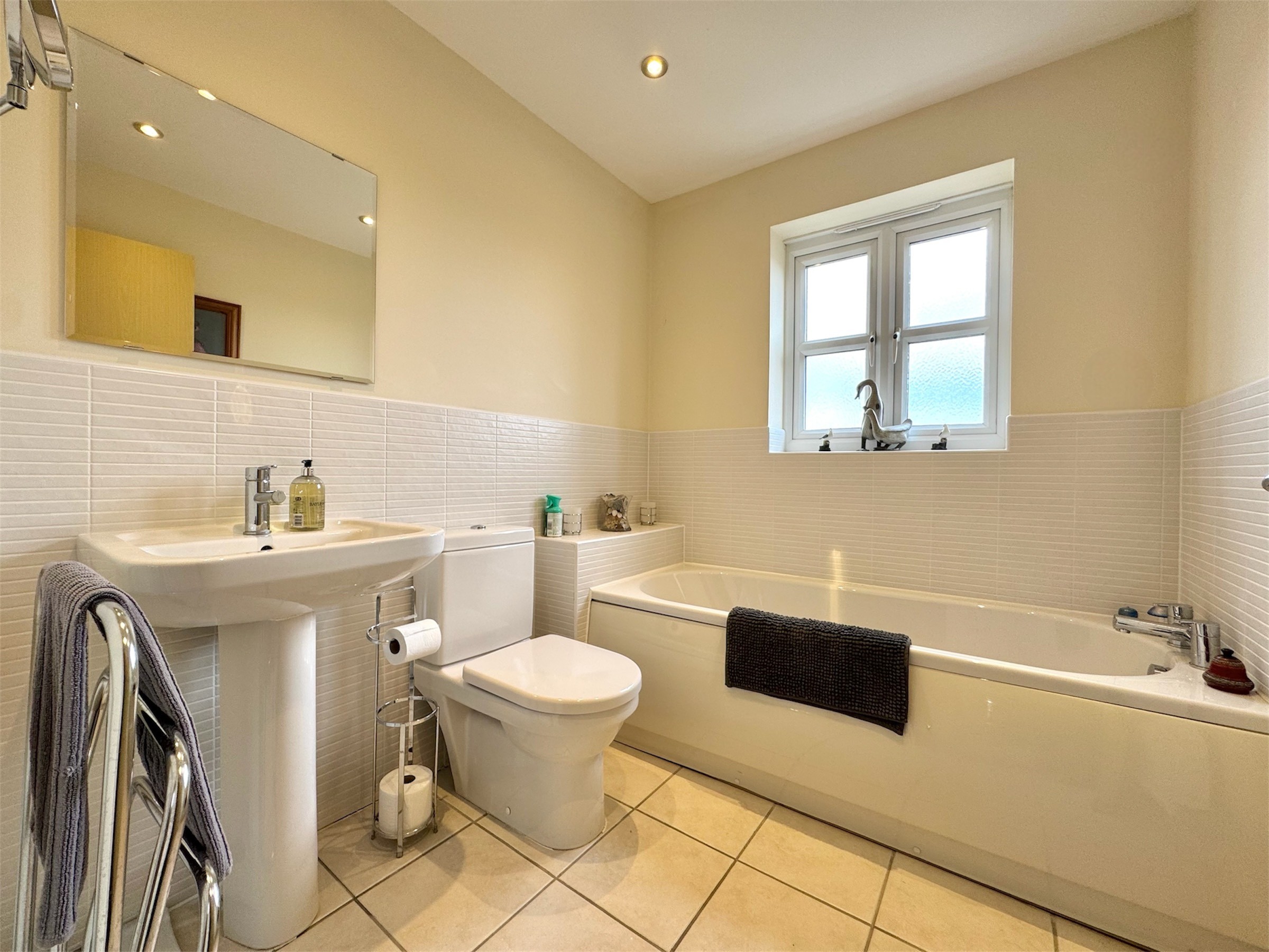 Frosted window to rear and a white suite to comprise: Low flush WC, pedestal wash hand basin and a panelled bath, tiled splash backs, tiled floor, ceiling down lights and an extractor fan.