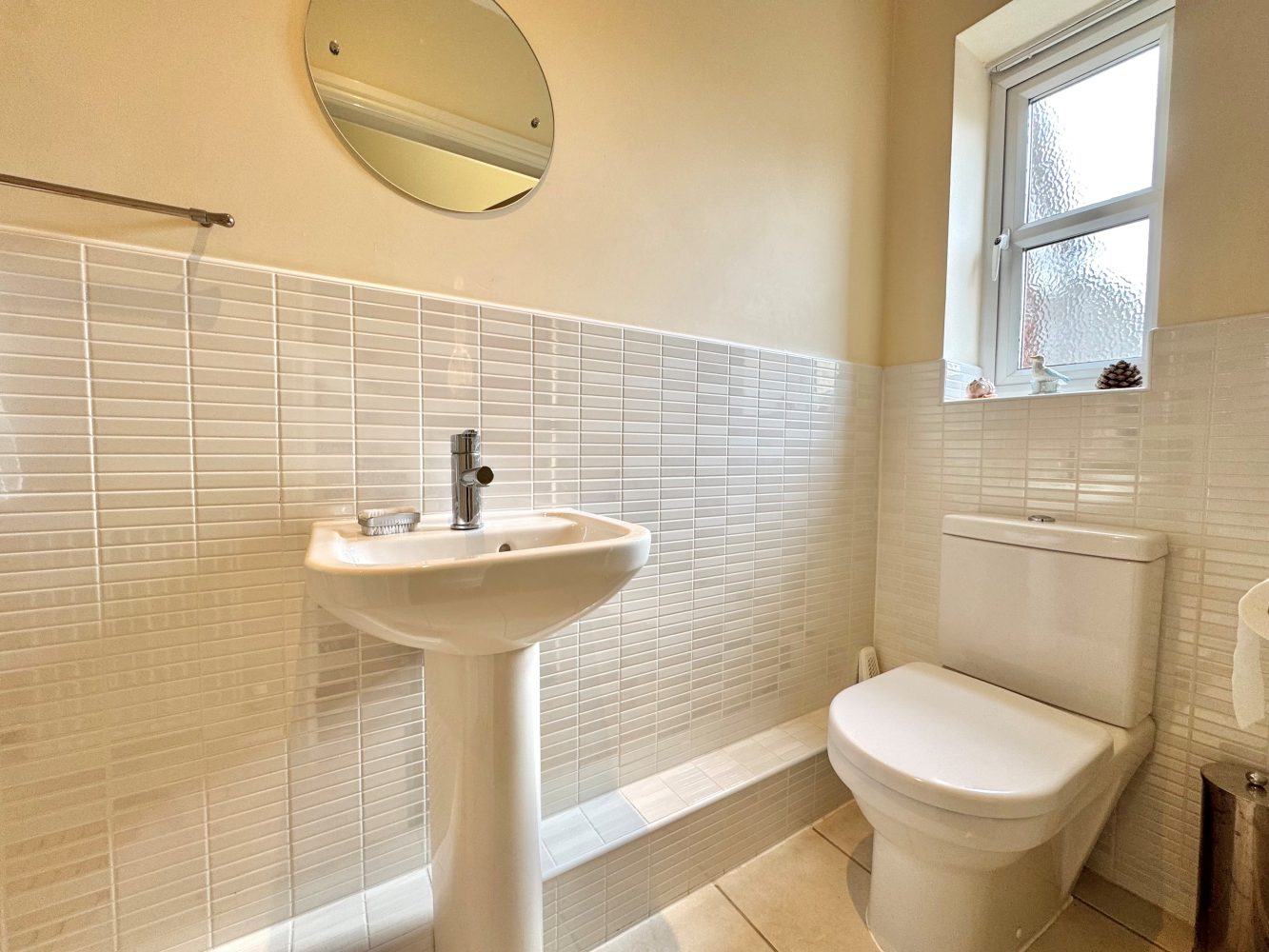 Frosted window to rear and a white suite to comprise: Low flush WC, pedestal wash hand basin and an independent shower cubicle with tiled splash backs, tiled floor, ceiling down lights and an extractor fan.