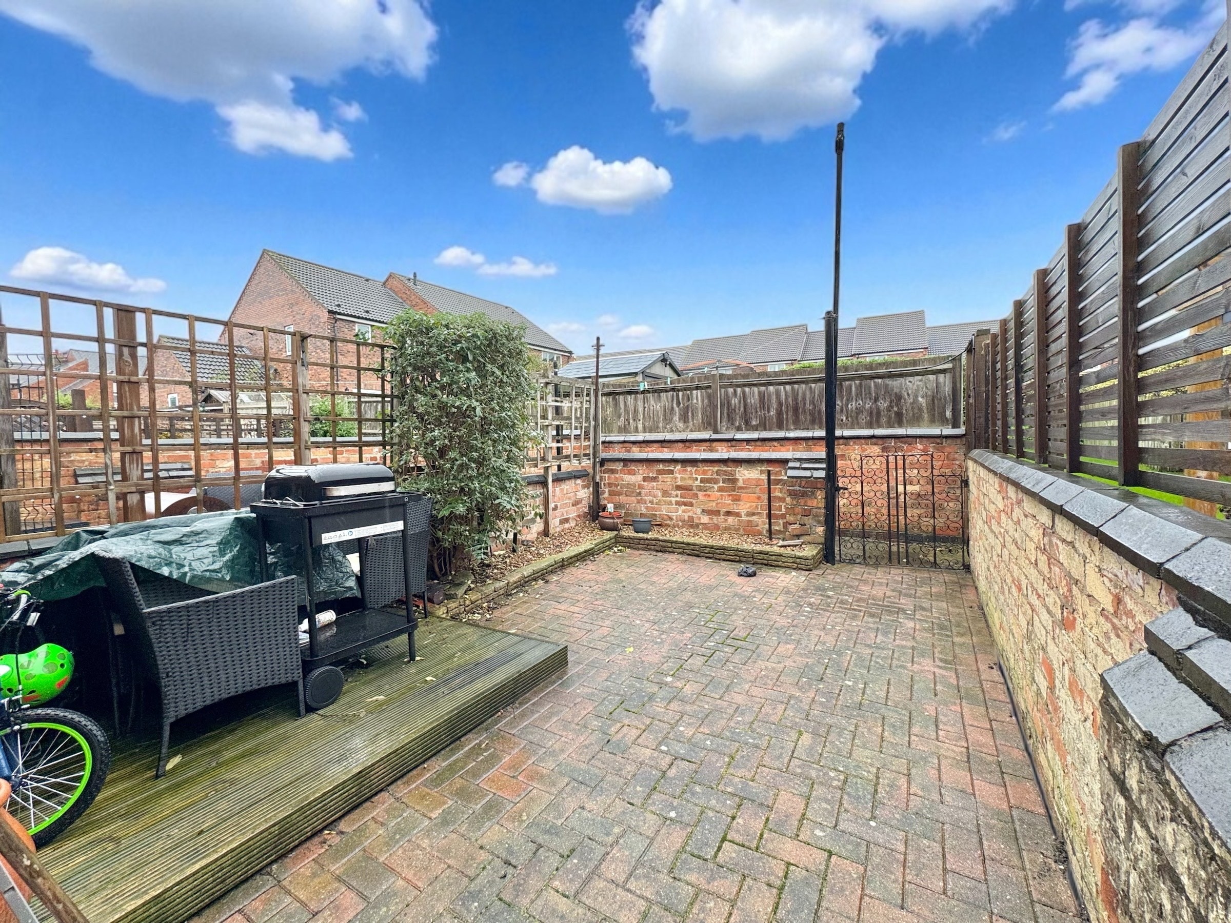 Mainly paved with shrubs and shingled borders and a decked area with courtesy lighting, an outside tap and gated rear access to a shared passage, all mainly enclosed by a brick dwarf wall.