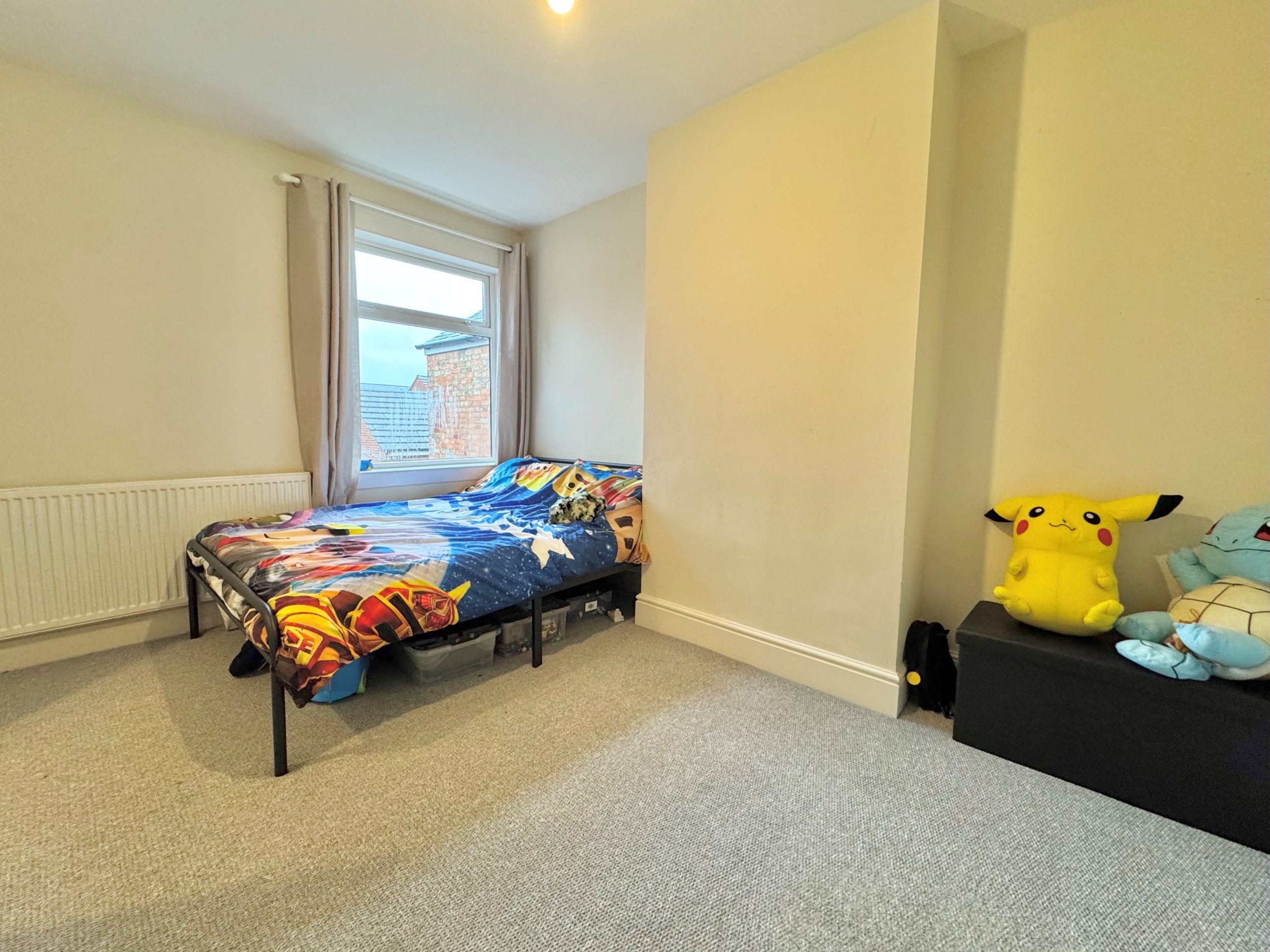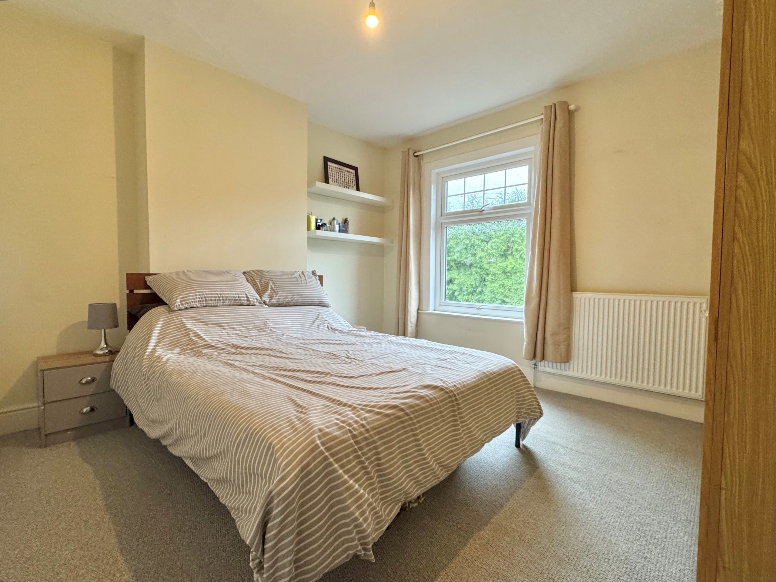 A double bedroom with a window to front and a range of fitted wardrobes and cupboards above along one wall and there is a built-in over stairs cupboard which has a loft hatch providing access to an insulated loft area.