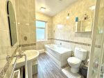 Frosted window to rear, fitted airing cupboard which houses a wall mounted 'Worcester' boiler and there is a white four piece suite to comprise: Low flush WC, pedestal wash hand basin, independent shower cubicle and a panelled bath, fully tiled walls and an extractor fan.