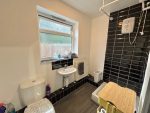Frosted window to rear and a white suite to comprise: Low flush WC, wash hand basin and an independent shower tray and tiled splash backs.