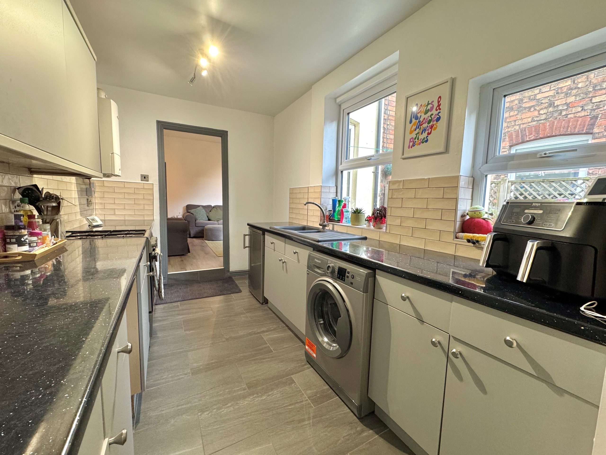Two windows to side and a range of eye and base level units with roll top work surfaces and tiled splash backs. There is a one and a half sink drainer unit, a gas cooker point, plumbing for a washing machine, space for a tumble dryer and a fridge and freezer, wall mounted 'Worcester' boiler, tiled floor and an archway to: