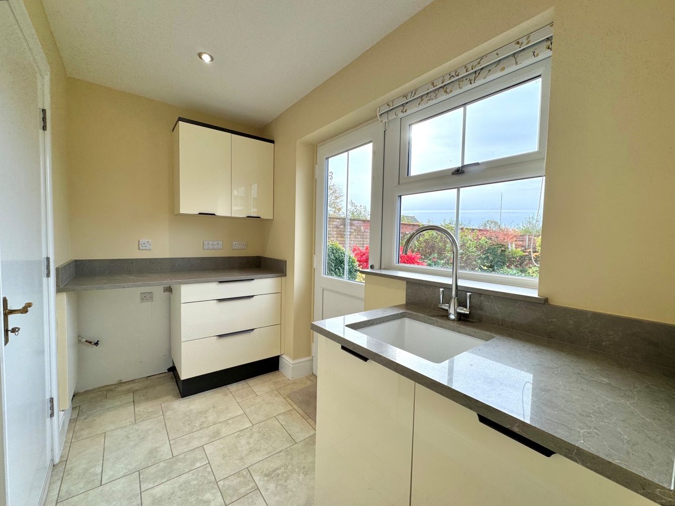 Window and a part glazed door to rear, door to the double garage and there is a range of fitted eye and base level units with Quartz work surfaces and splash backs, sink, plumbing for a washing machine and there are ceiling down lights.