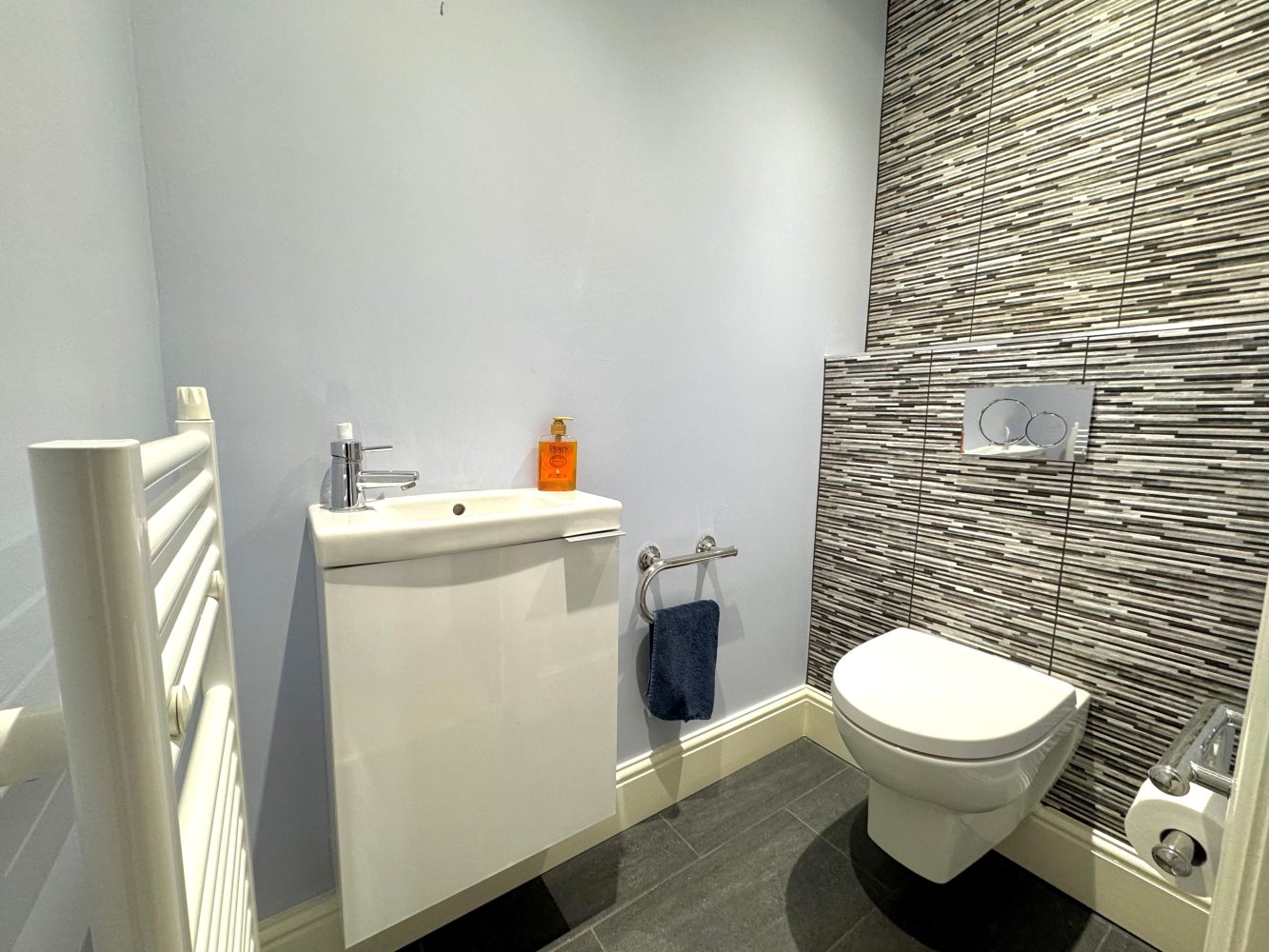A two piece suite to comprise: Low flush WC and a vanity unit wash hand basin, tiled splash backs, tiled floor, heated towel rail, ceiling down lights and an extractor fan.