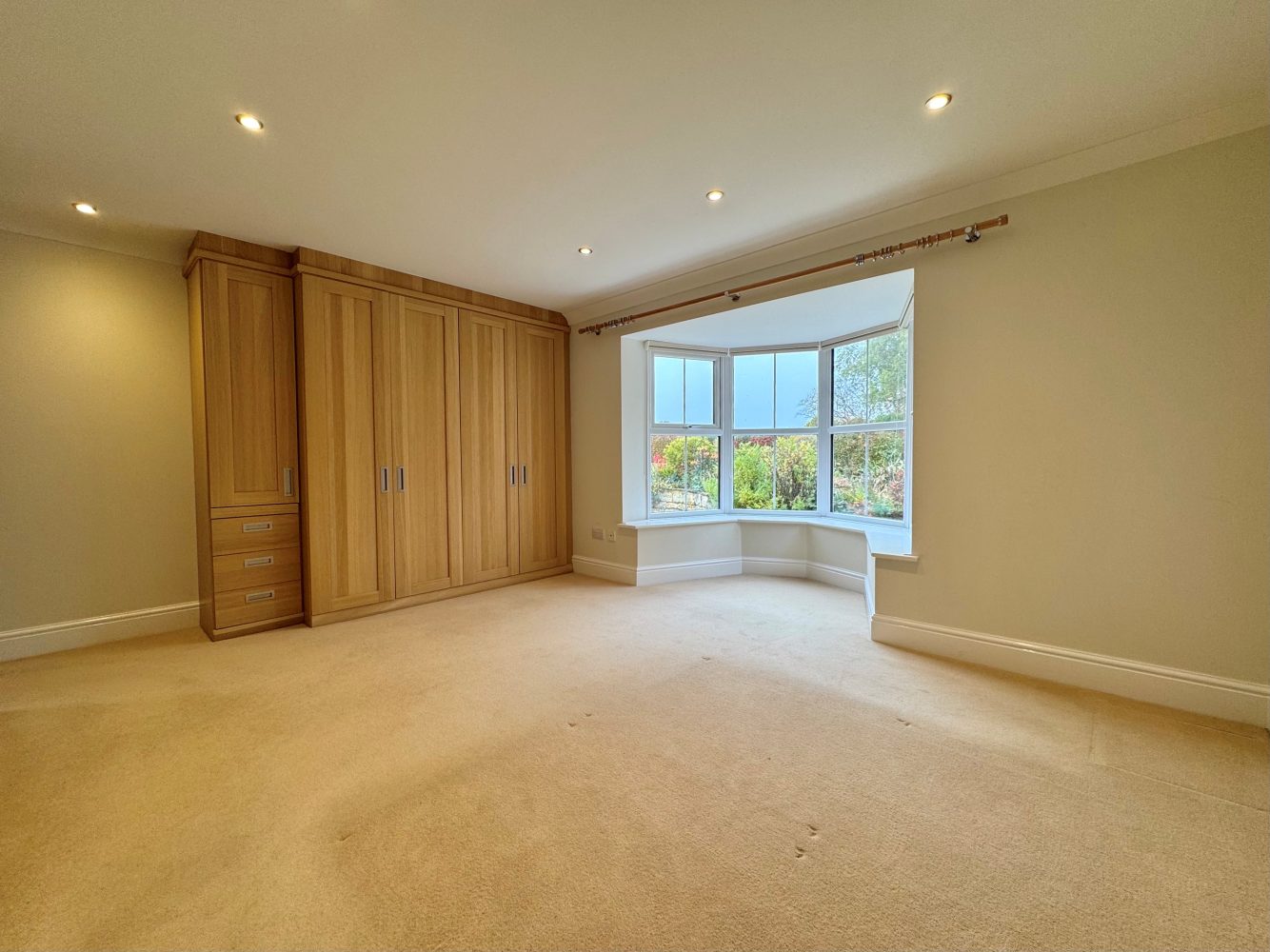 Walk-in bay window to rear, ceiling down lights and a range of fitted wardrobes and drawers along one wall, door to:
