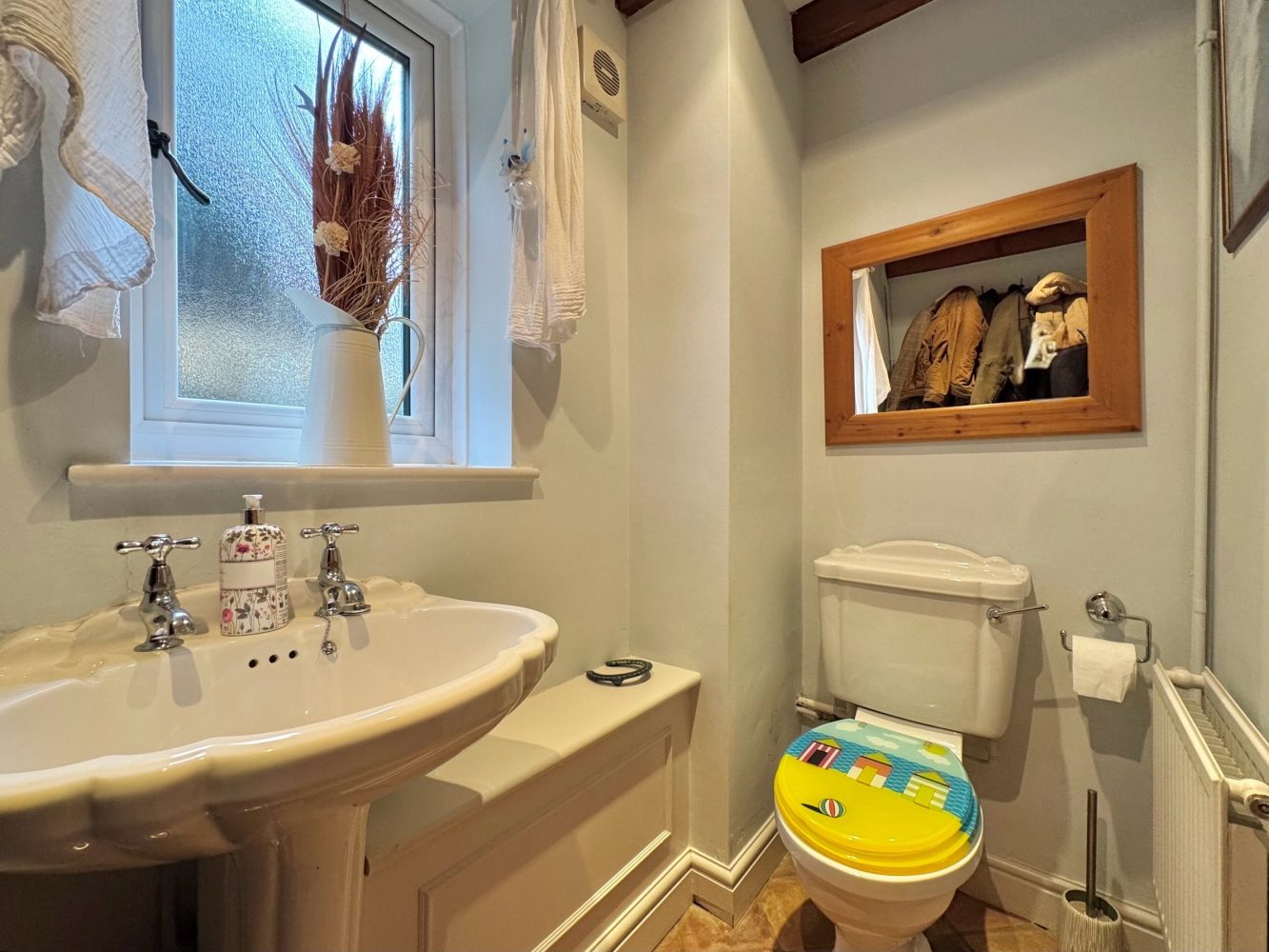 Frosted window to rear and a two piece suite to comprise: Low flush WC and a pedestal wash hand basin with tiled splash backs, tiled floor, exposed ceiling beam, ceiling down lights and an extractor fan.