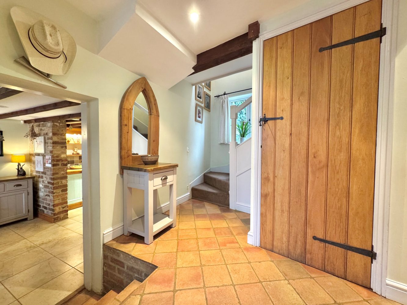 Window to rear, staircase leading up to the first floor landing with an under stairs cupboard, exposed ceiling beams, ceiling down lights, tiled floor and panelled doors to: