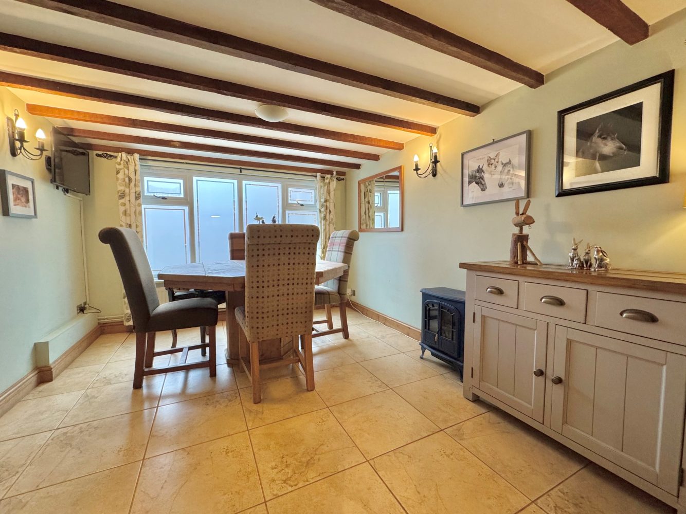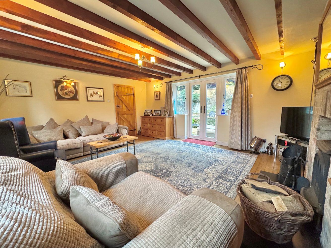 A lovely dual aspect room which has two windows to front which have solid oak internal shutters, glazed french doors with two windows to rear, there are exposed ceiling beams, a wooden floor and a multi-fuel log burner with a brick built surround.