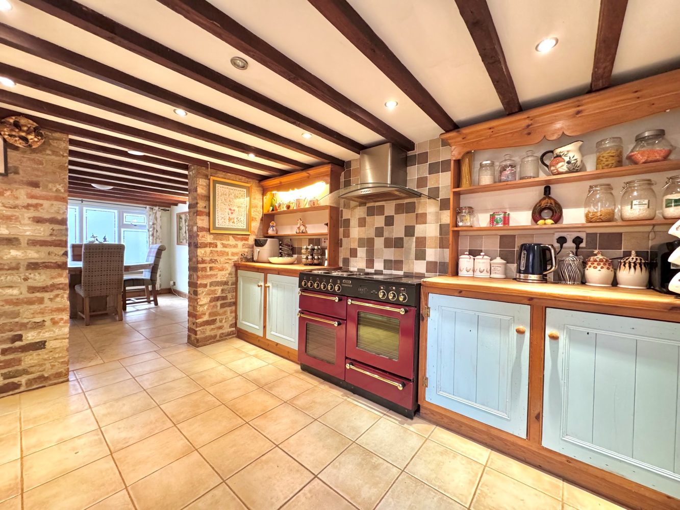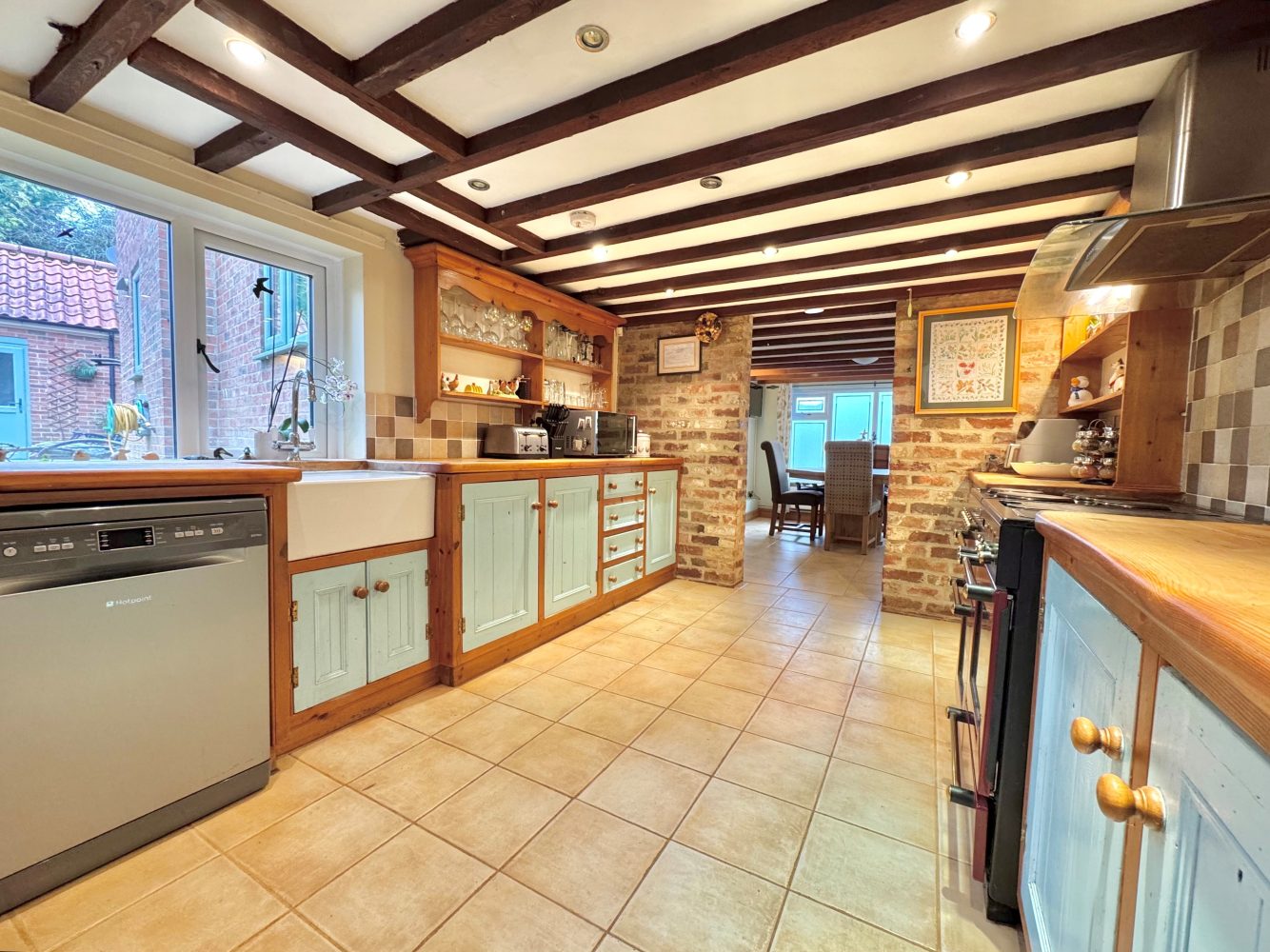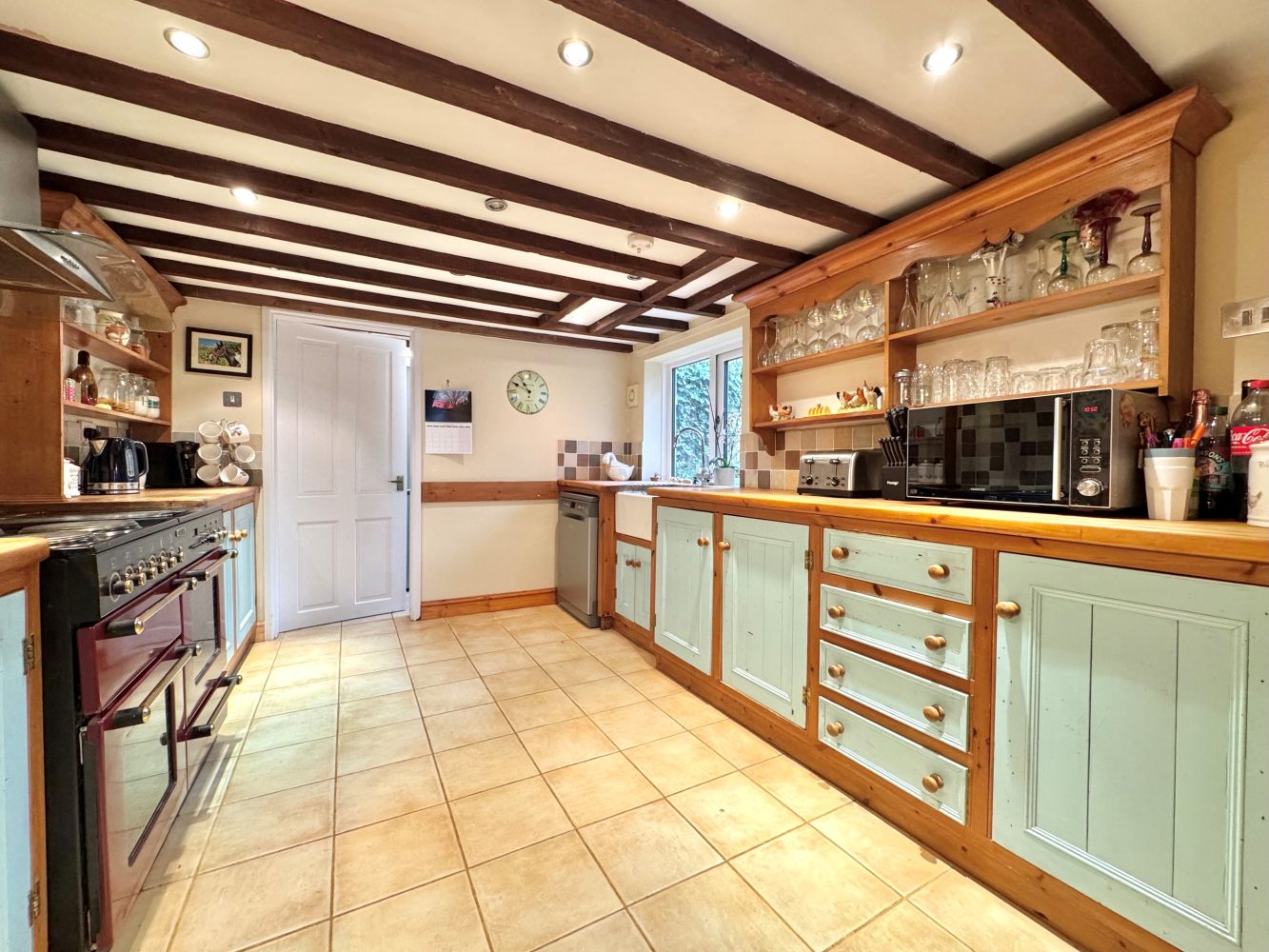 Window to side, exposed ceiling beams with down lights and a range of eye and base level units with wooden work surfaces and tiled splash backs. There is a butler style sink, a range cooker with an extractor fan hood, a dish washer, tiled floor and a panelled door to:
