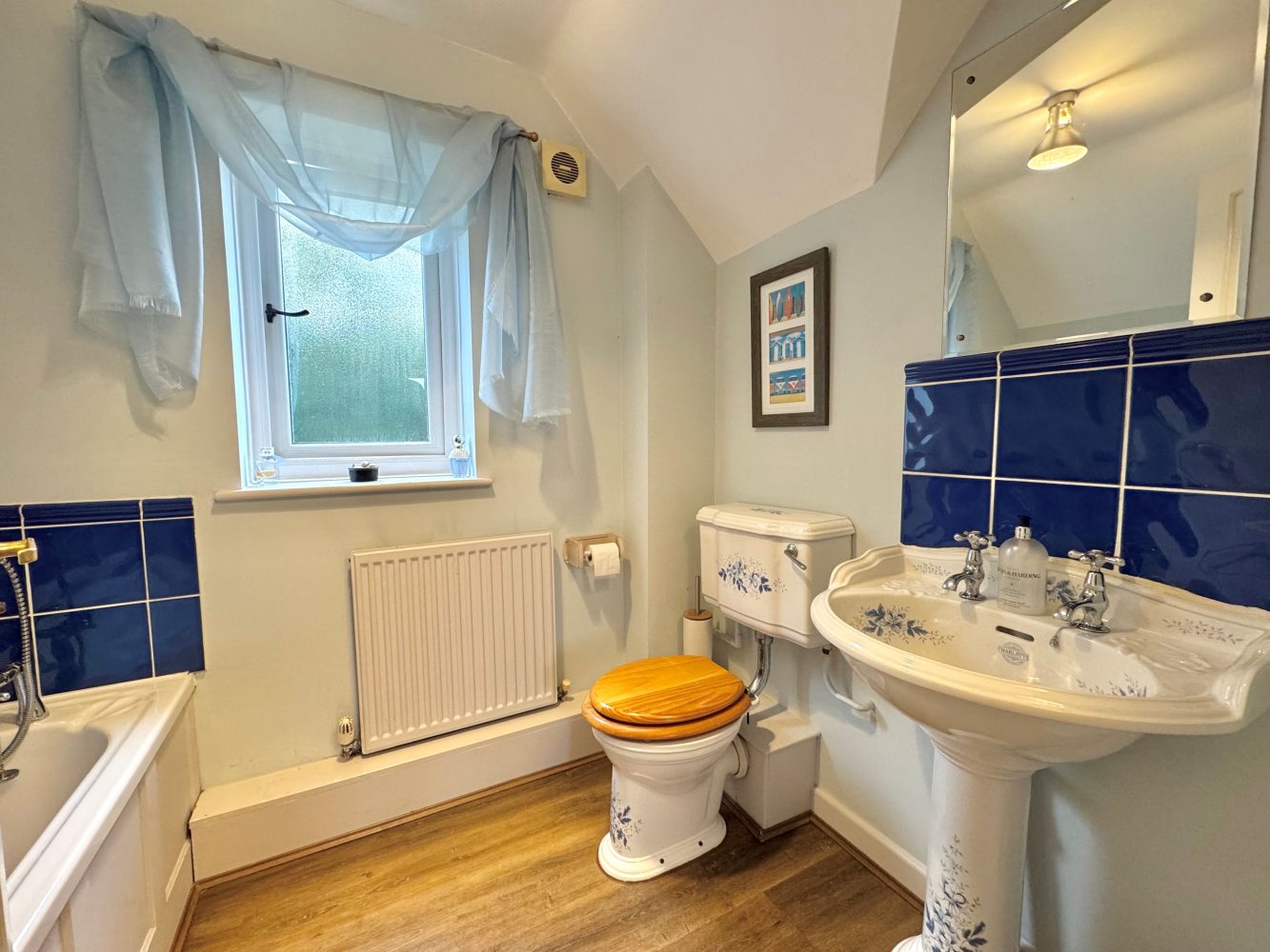 Frosted window to rear and a white suite to comprise: Low flush WC, pedestal wash hand basin and a panalled bath with a telephone style shower tap attachment, tiled splash backs and exposed ceiling beams.
