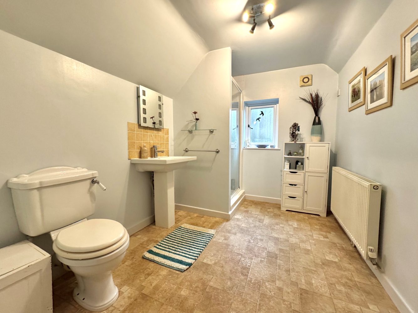 Frosted window to side and a white suite to comprise: Low flush WC, pedestal wash hand basin and an independent shower cubicle, tiled splash backs, extractor fan and there is a door to an eaves storage area.