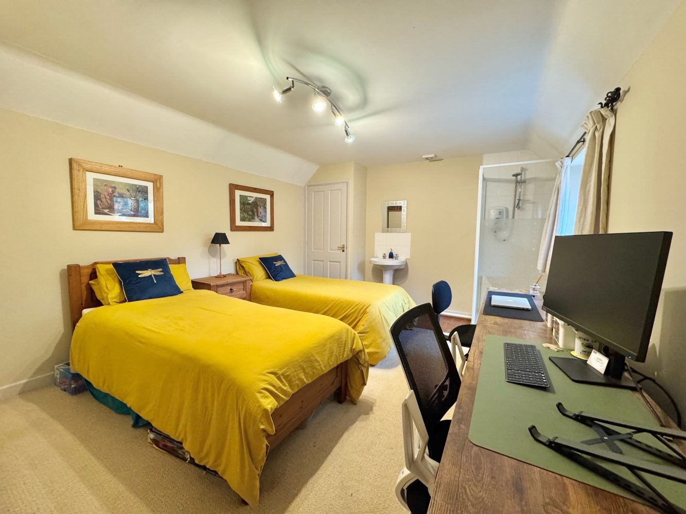 A generous sized double bedroom with a window to side and a two piece suite to comprise: Independent shower cubicle, a pedestal wash hand basin with tiled splash backs and a built in cupboard.