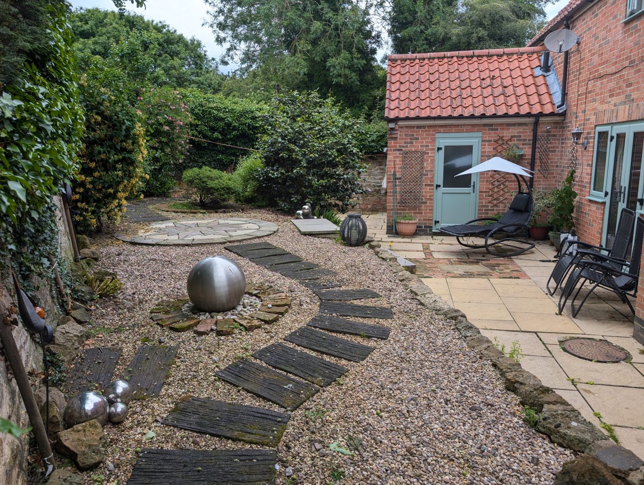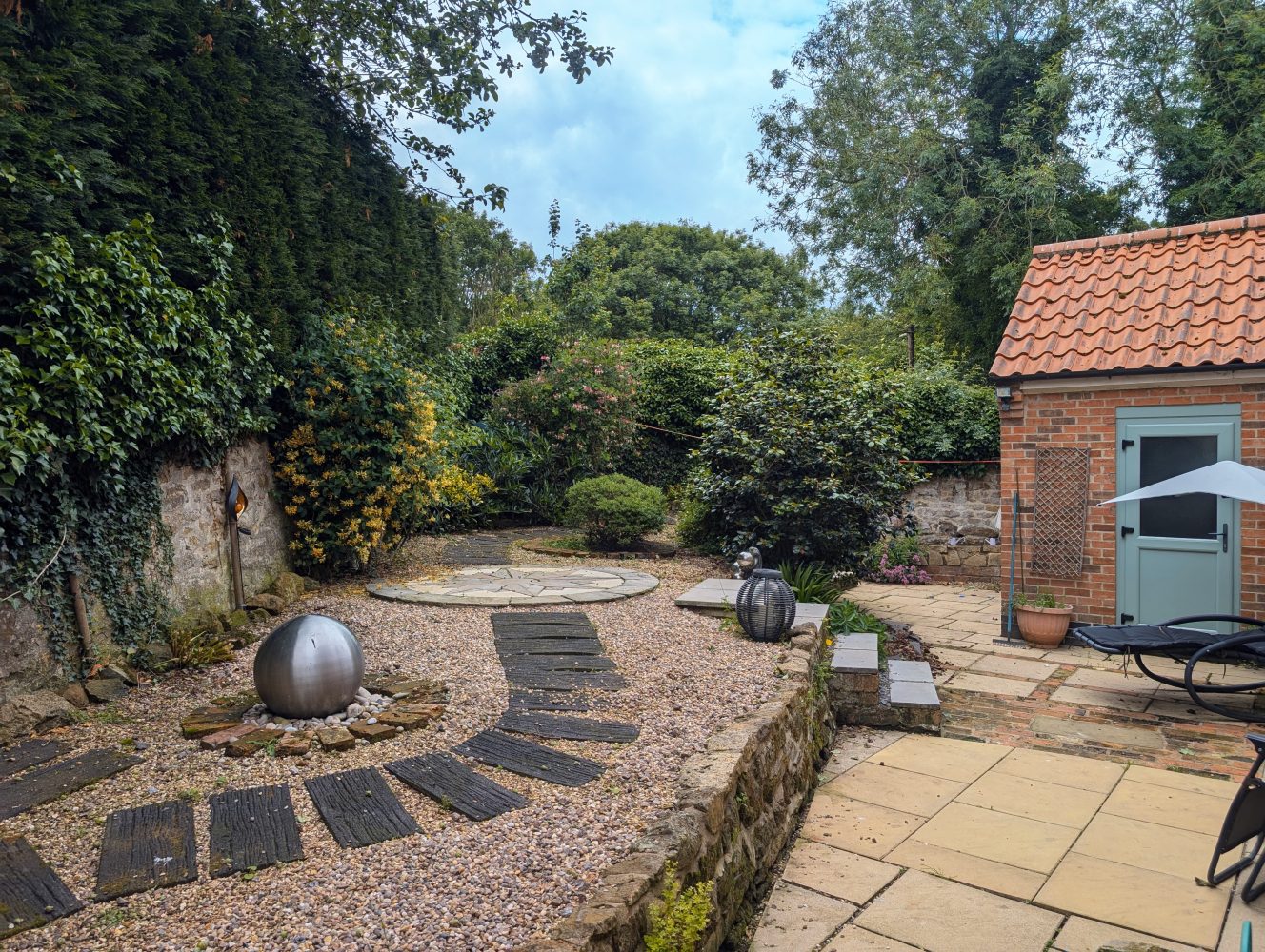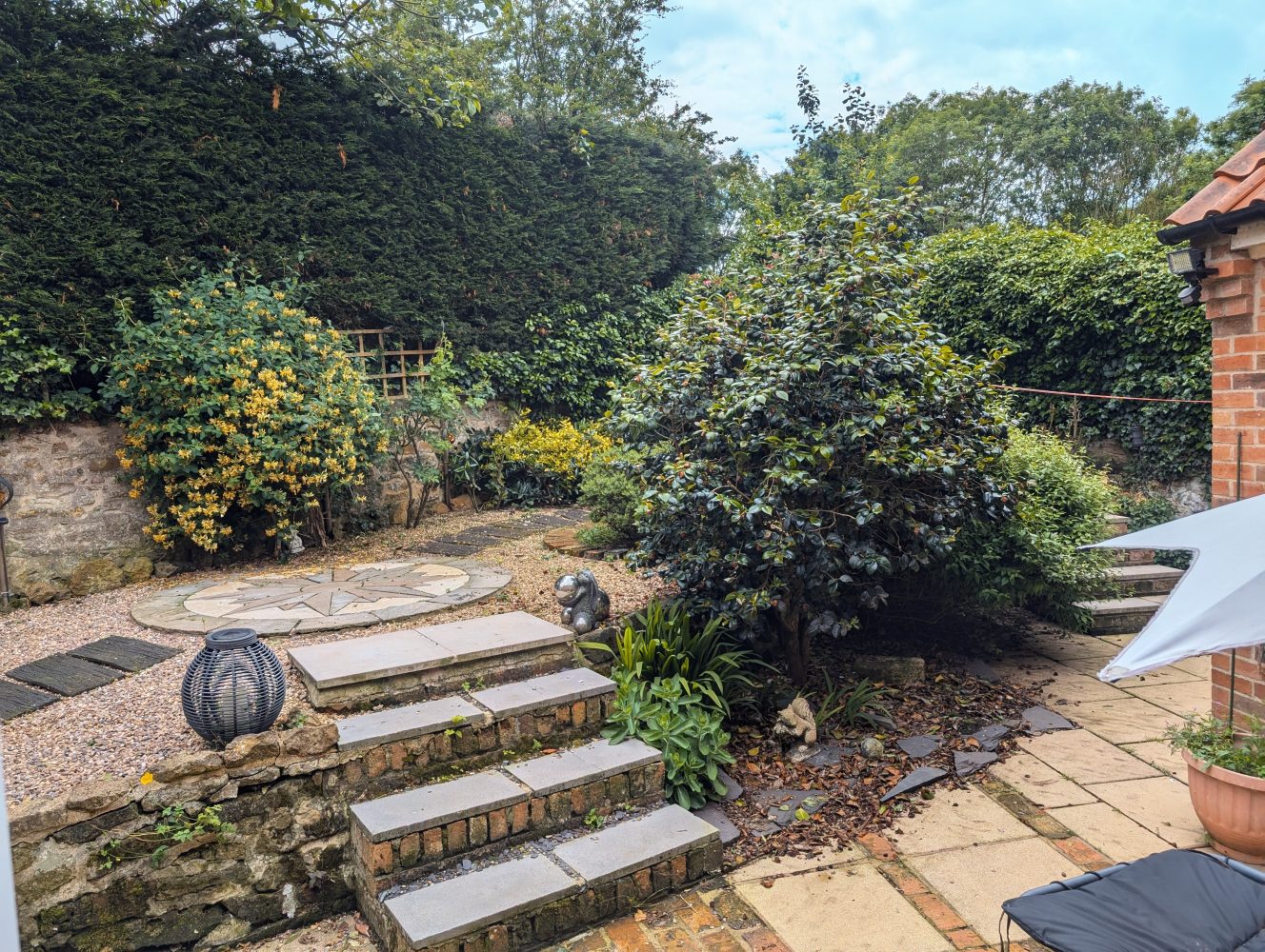 A well tended and well enclosed walled garden which has an extensive patio area with courtesy lighting, an outside tap, wood store and steps leading up to a part paved and shingled area with well established flowers, shrubs and hedging.