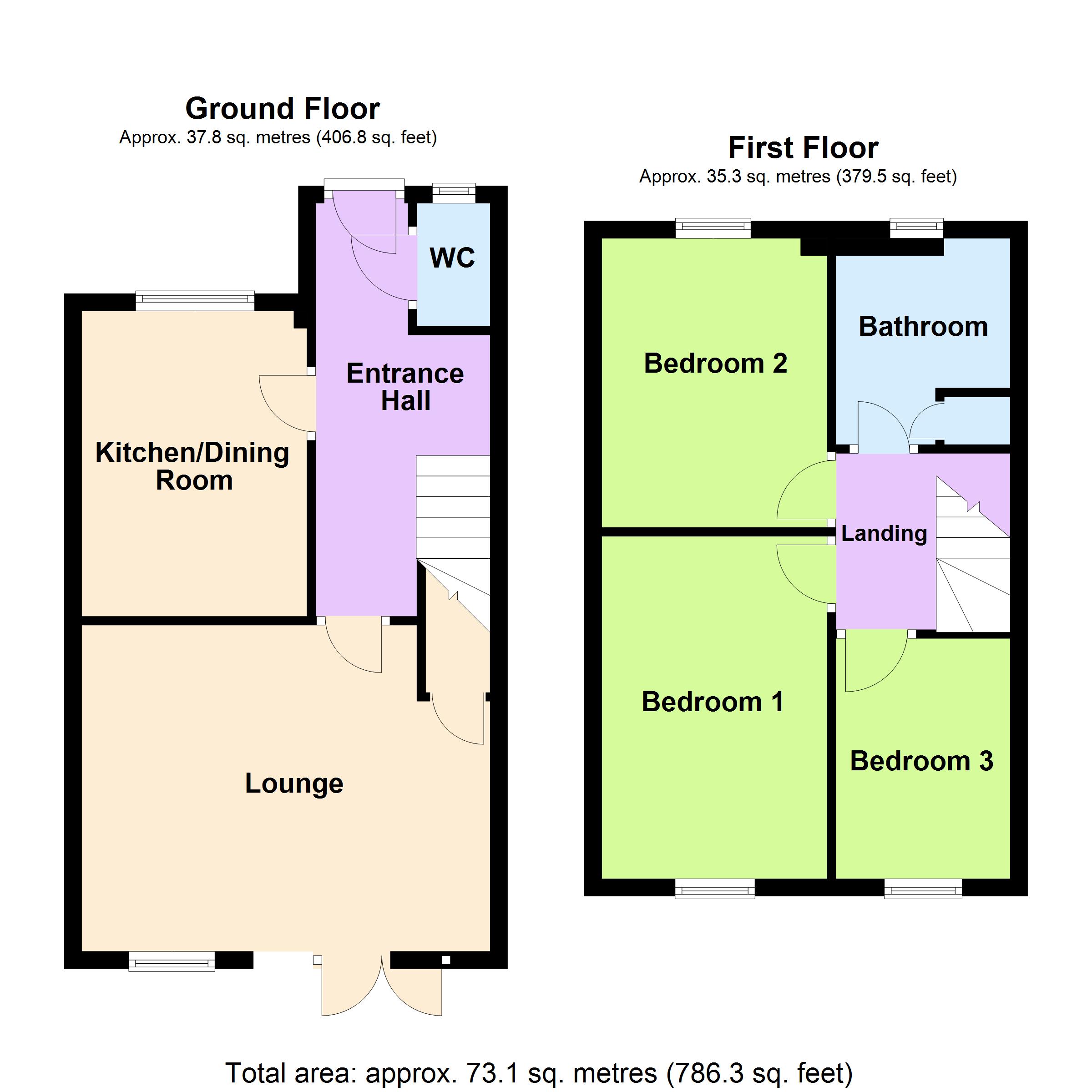 Frosted window to front and a two piece suite to comprise: Low flush WC and a wash hand basin with tiled splash backs and an extractor fan.