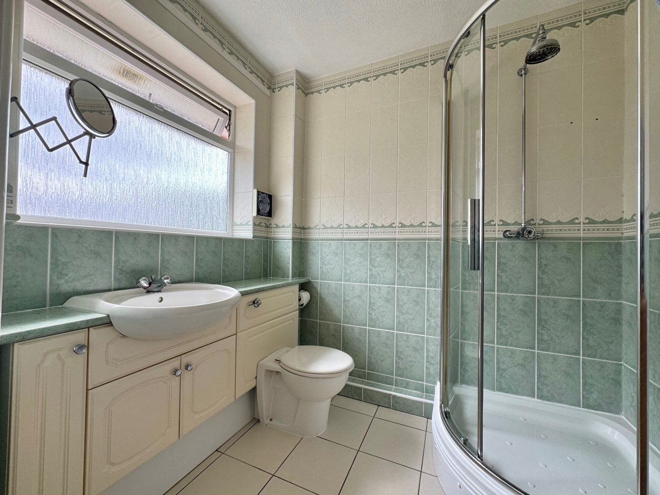 Frosted window to rear and a three piece suite to comprise: Independent shower cubicle, low flush WC and a vanity unit wash hand basin with a counter top with cupboards below, fully tiled walls, tiled floor, heated towel and an extractor fan.