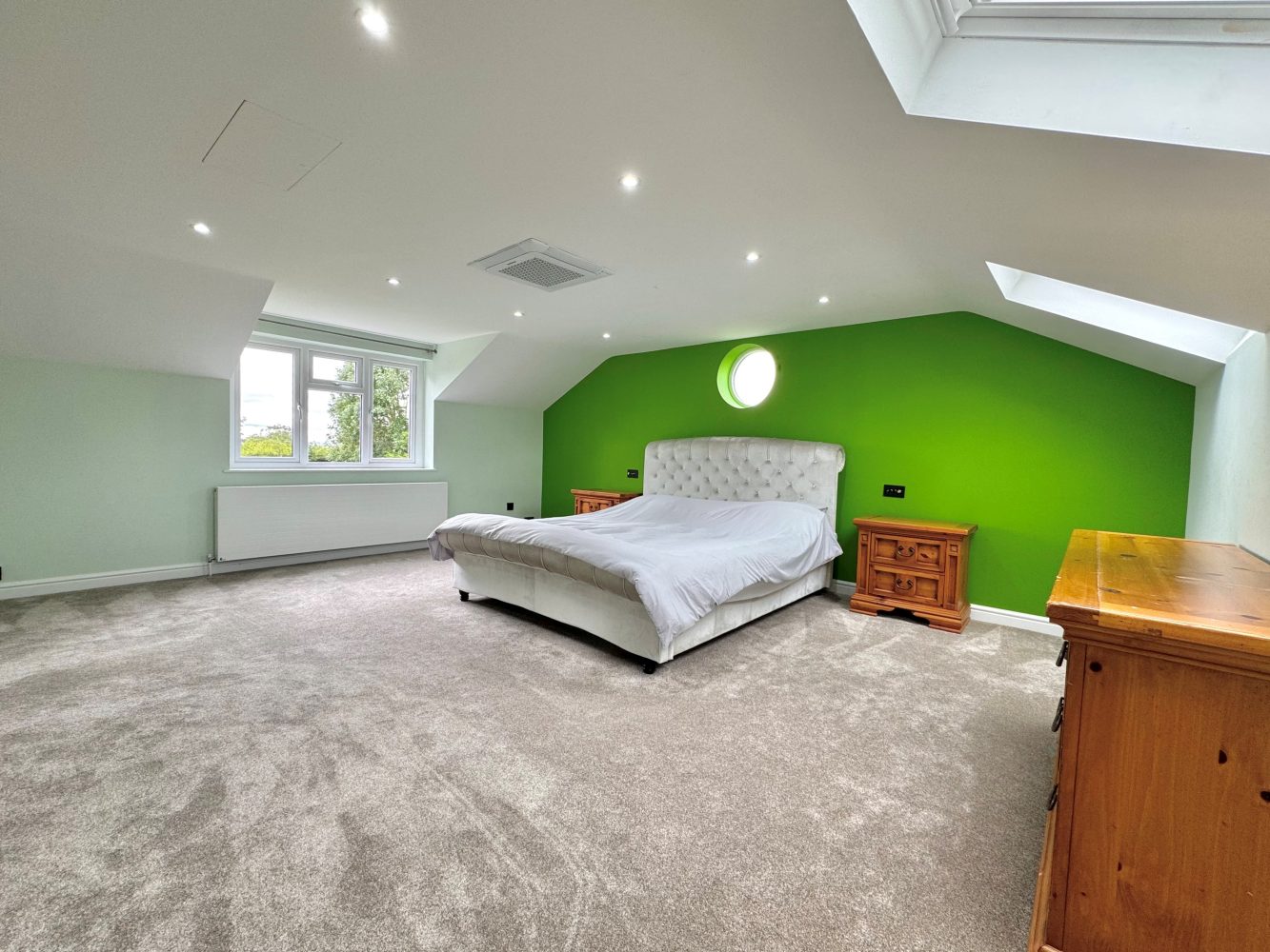 An impressive sized and triple aspect with two velux ceiling windows to front, window to rear and ceiling down lights and a door to: