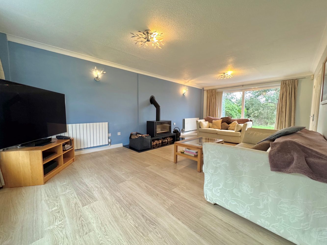 A lovely light and dal aspect room with a bow window to front, sliding patio door to rear and there is a multi-fuel log burner with a stone hearth, and double doors to: